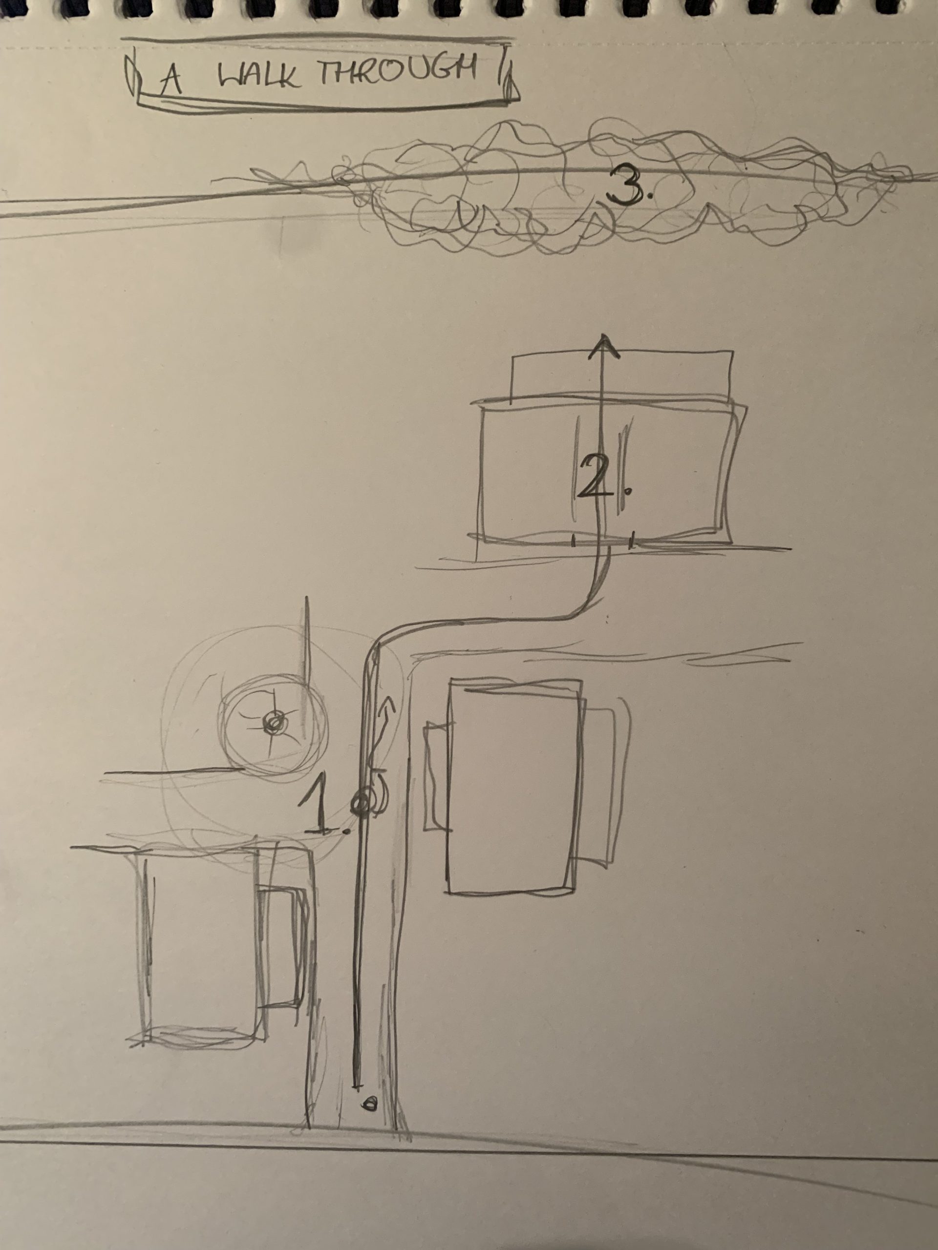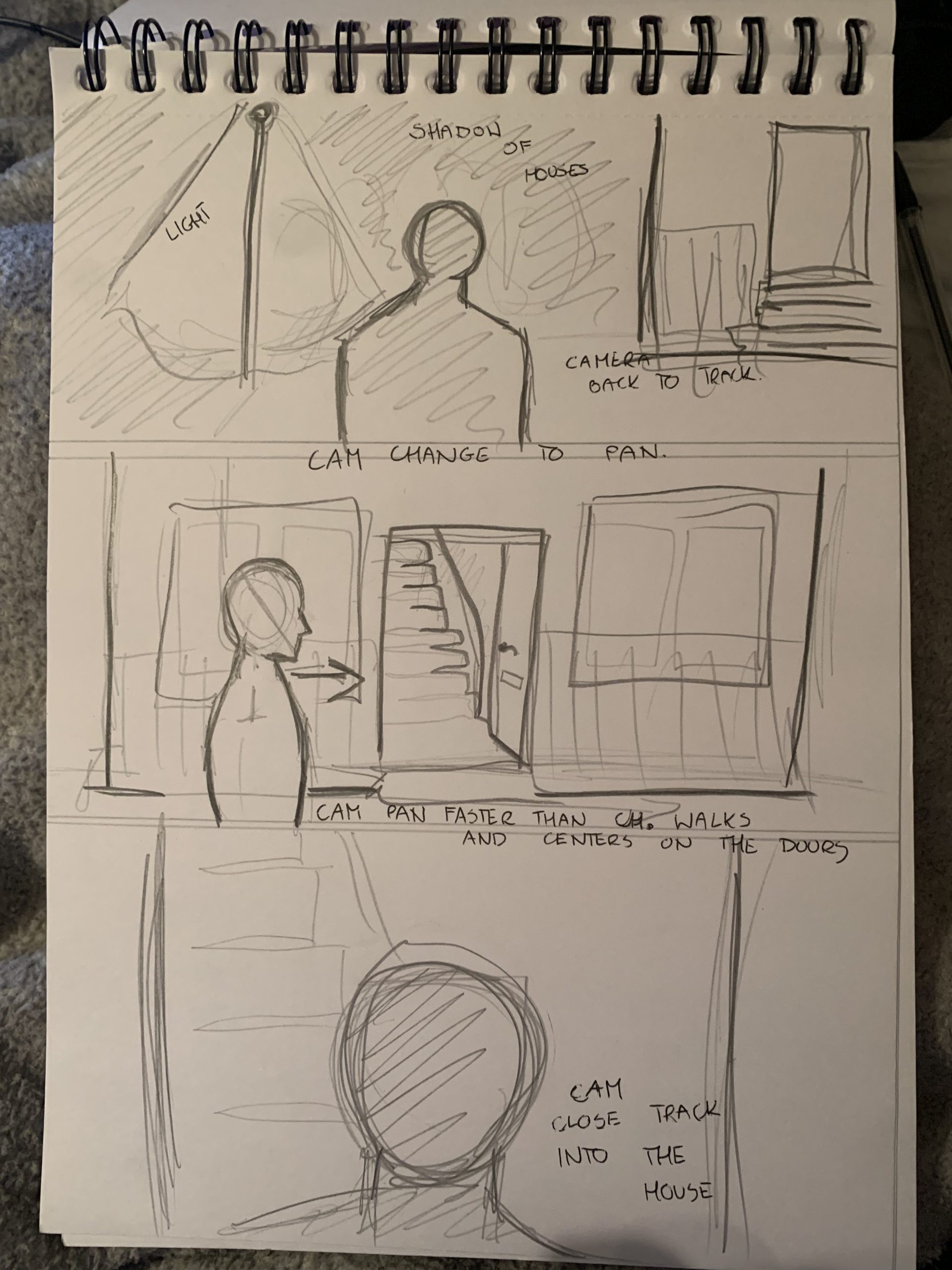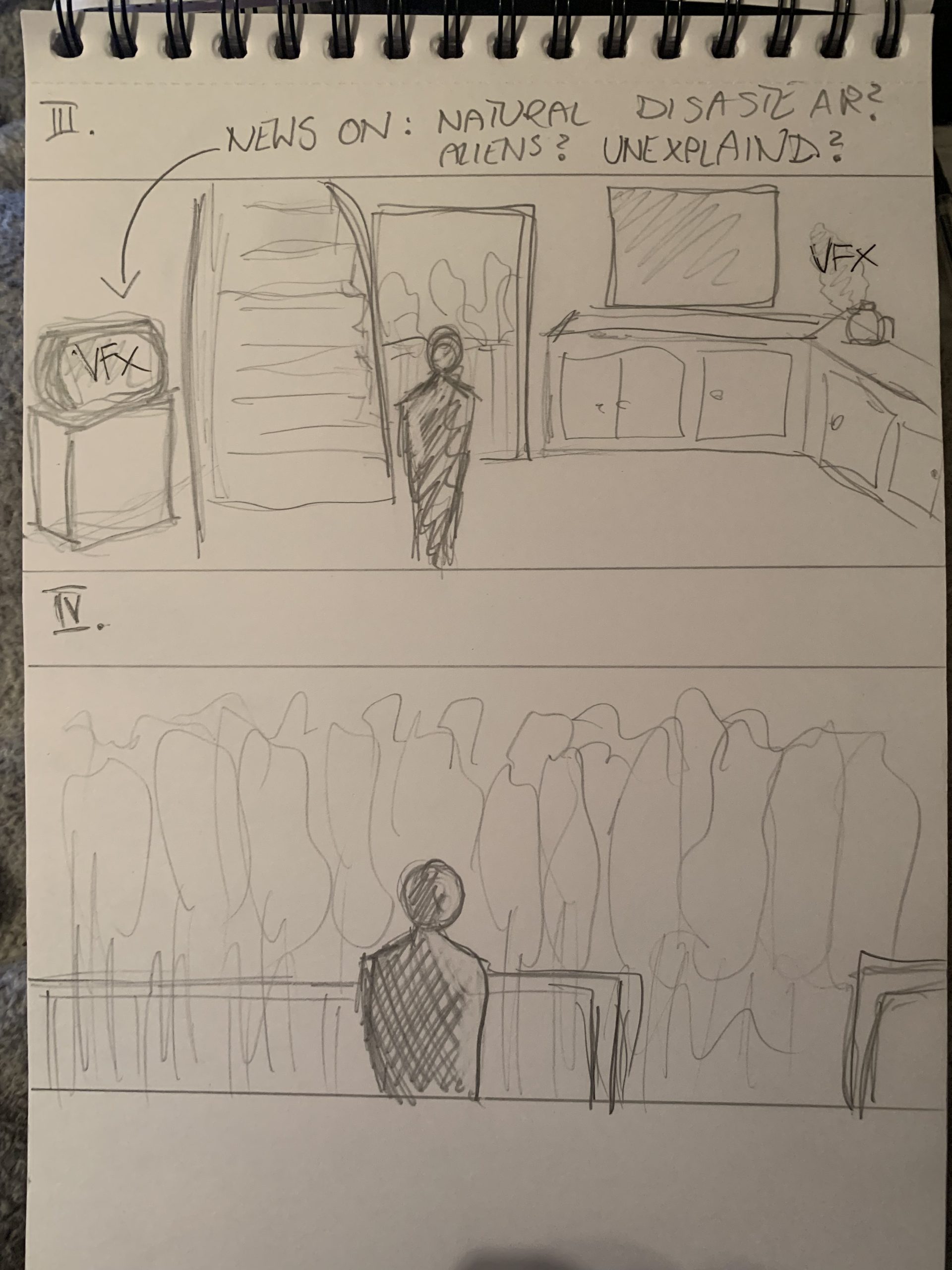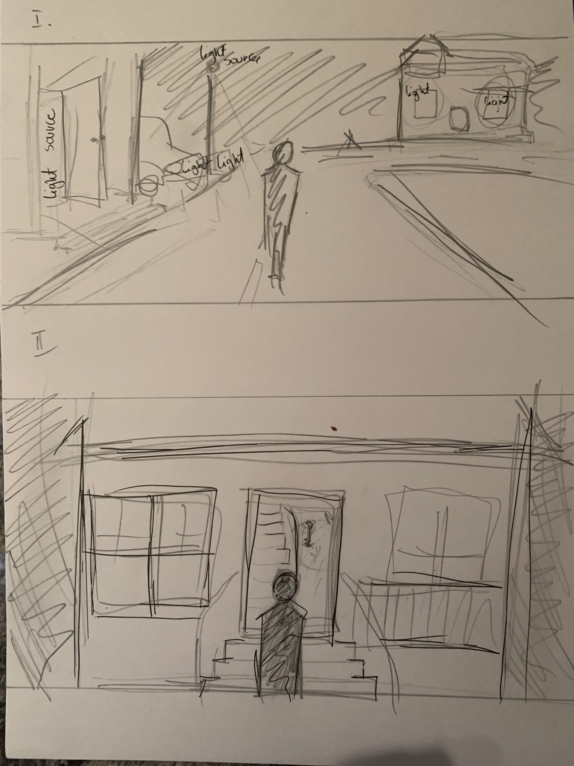 I decided to create a short storyline with the main character walking by a suddenly empty houses, and add a catastrophe/supernatural element to it. I also wanted to show both exteriors and interiors, and taking all of that into consideration, I planned out a simple walk-through and made some storyboards. The story I ended up with is: