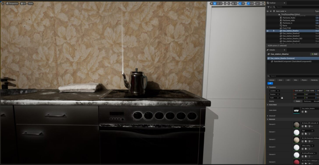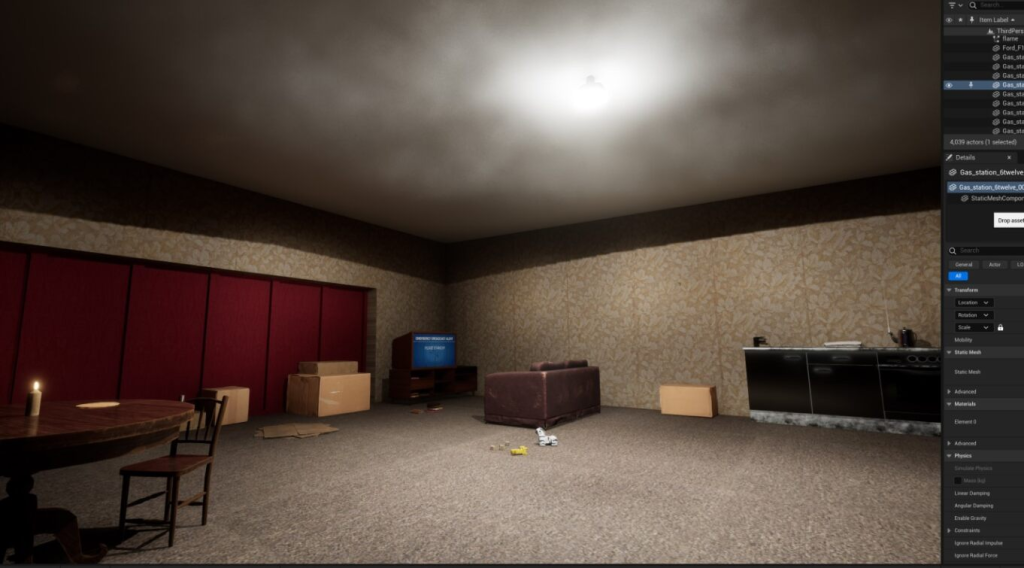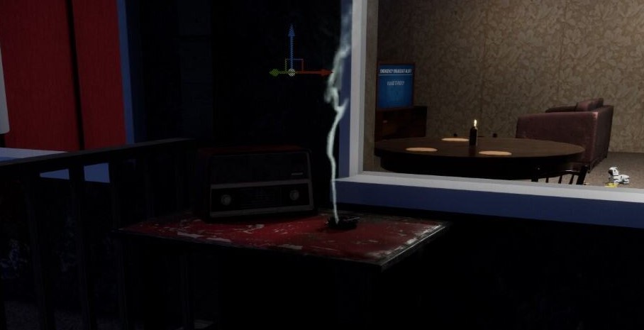 Next, I focused on the interior of the building my character was going to go into. This was also a moment to make a final decision on what effects I would like to have there. I opted for a kettle, ashtray and a tv inside, and a haze, rain and flickering lights outside. I ended up also adding a burning candle.