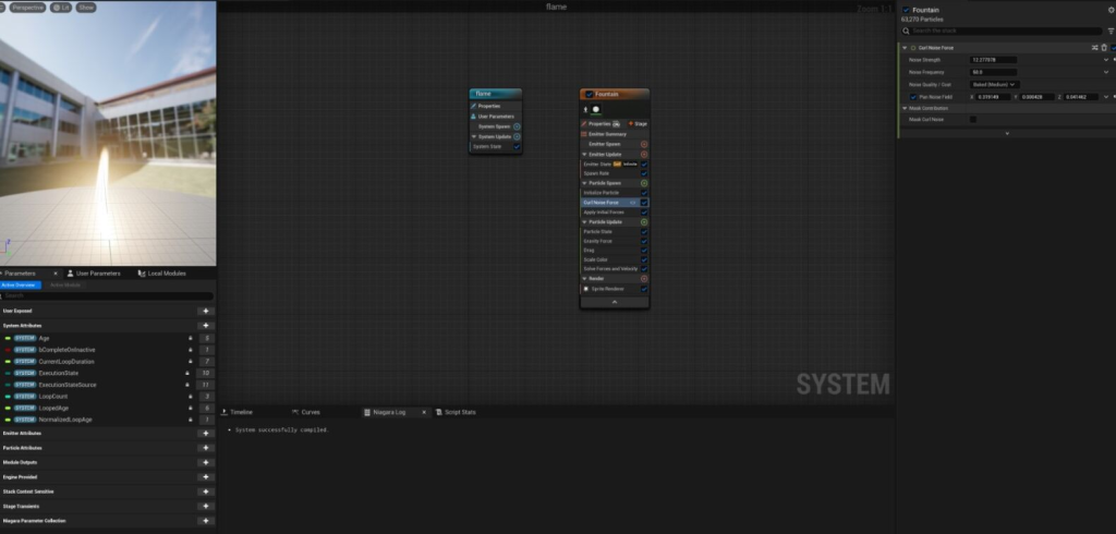 Instructions for those two vfxs being similar ended up being a good thing, as it inspired me to create my own effect completely by myself. While working on them, I realized that similar process could be used to make a candlelight. I created a new Niagara System and chose a fountain option. Then, in the Particle Update, I deleted Shape Location and Add Velocity and added a Curl Noise Force, changing the setting of it only slightly, much less then in the previous effects, to give it a flickering effect. I then experimented with the size of it, making sure that the vfx is bigger at the bottom, and, after finding the combination I though worked best, I changed the colour to orange.