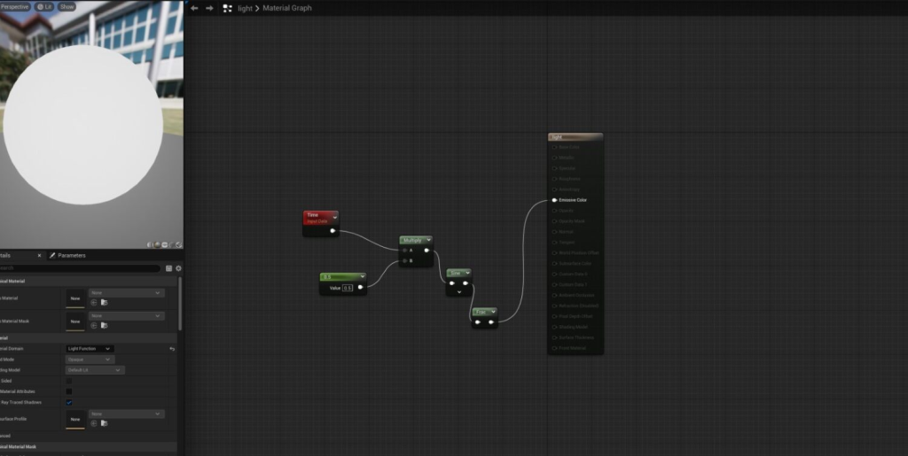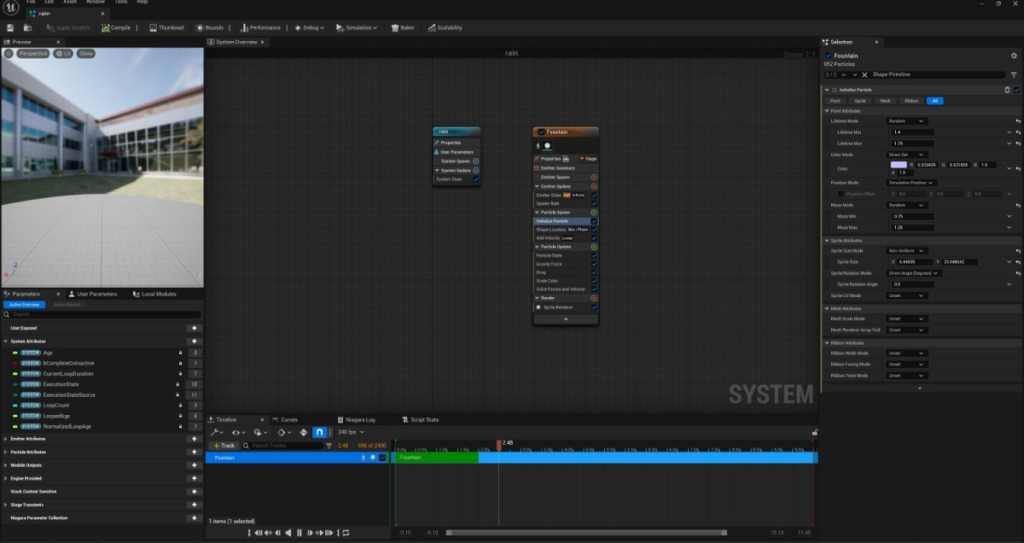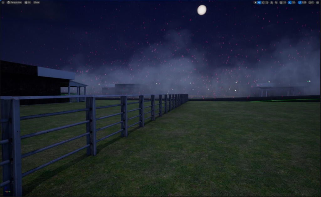 Last, I wanted to create a rain. I started up by following a tutorial by Matt Aspland on YouTube, which included creating a Niagara fountain system, deleting Sphere Location and Add Velocity in Cone, adding a Box Location and changing parameters of it. I then experimented with the Spawn Rate and Initialize Particle option. However, after completing a part of it and trying out different options in the meantime, I changed my mind of how I am going to use it – I made it bounce from the floor, made its particles bigger, changed the colour to red and mixed it with the already existing in Unreal Engine Cloud Effect, to enhance how unnatural it looks. I also added some lights, which reflected from the particles, enhancing the shine. The inspiration for the colour red was the Hex from recent Marvel films.