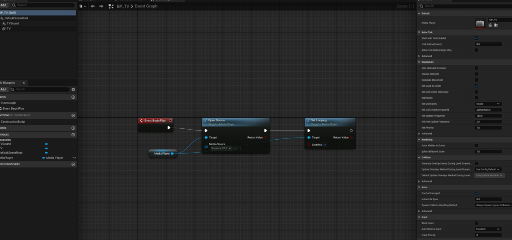 The process of making it, following instructions by InsertNameHereGameDev, included importing the video as a material. The model of the TV was made in Maya, as I have used this program in the past, making sure that there are two separate materials for the TV and the screen. I then created an actor blueprint, in which I opened the TV model. I then added the video in an Event Graph.
