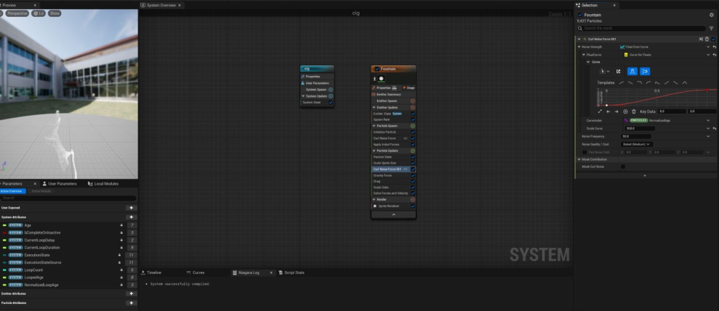 For the cigarette smoke, I used instructions by Coreb Games on Youtube. It involved creating a Nigara system in a form of a fountain, changing drastically Spawn Rate, then deleting Shape Location and Add Velocity and adding Curl Noise Force in Particle Spawn. Then, in Gravity Z I changed force value and changed the curve. The big two changes were also changing the colour to translusent as well as adding Float from Curve in Drag. I ended up not following the tutorial to the end, as I preferred how uneven the smoke was at this point, which worked as the smoke was suppoused to be set outside on a windy day.